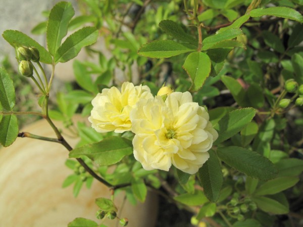 先日アップした鉢植えのモッコウバラが、花開きました。