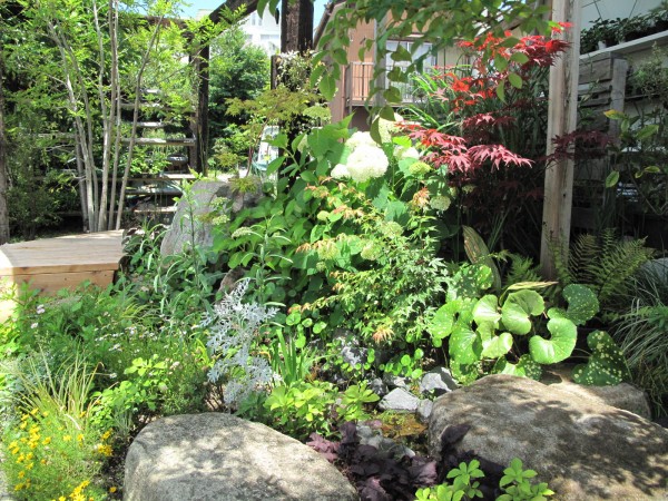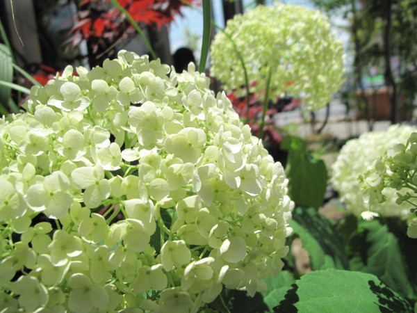 T’sの庭を流れる川周りでは、アナベルが咲いています。