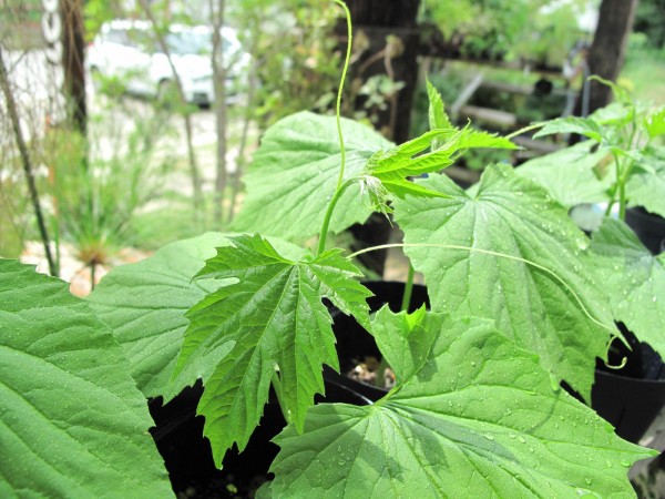 本葉も開いて、ゴーヤの葉らしくギザギザと手のひらの形になってるのがよく分かりますね~。