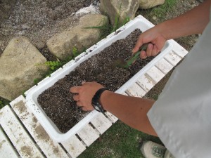 堆肥・山砂・ネニサンソをよく混ぜたものをプランターに入れます。