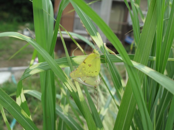 今朝、屋根に上がったらツガイの蝶が、ススキの葉裏で羽を休めていました。