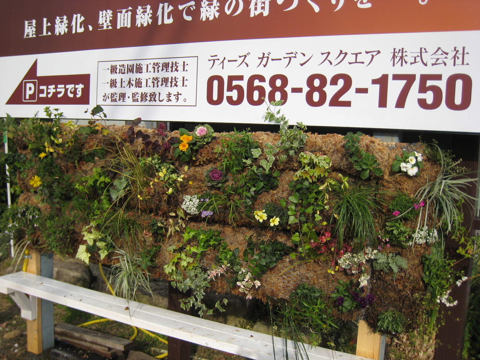 大看板の下に壁を作り、壁面緑化しました!ヽ(^。^)ノ