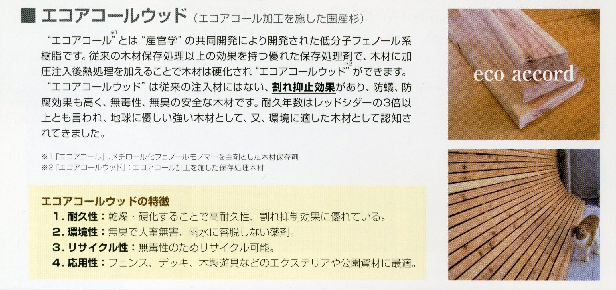 ・・・従来の技術では、 薬剤そのもに強い毒性が必要だった。また 薬剤の溶脱は防げなかったし、寸法の安定性も見られなかった 。エコアコールウッドは それらの困難とされていた問題点を 解決し、毒性を示さない樹脂による防腐・防蟻・寸法安定・ 薬剤の溶脱をクリアした 保存処理木材なのです。