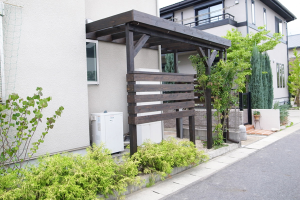 デザイン性の高いサイクルポートです。 敷地の角にアルミのカーポートでは見た目が悪いので こういった、誰からも見られる場所には デザイン性のある物を設置した方がいいですね。