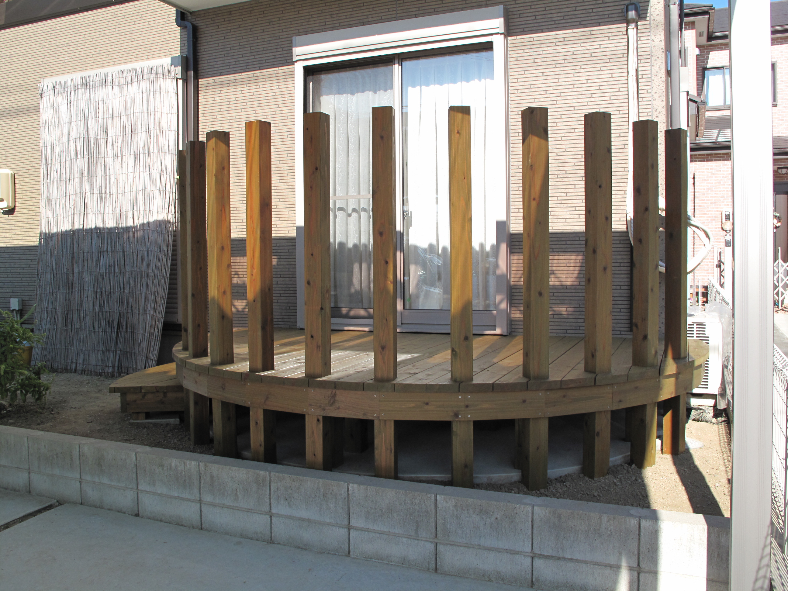 真ん丸なウッドデッキとスリットフェンスが融合したデザインのウッドデッキです。
