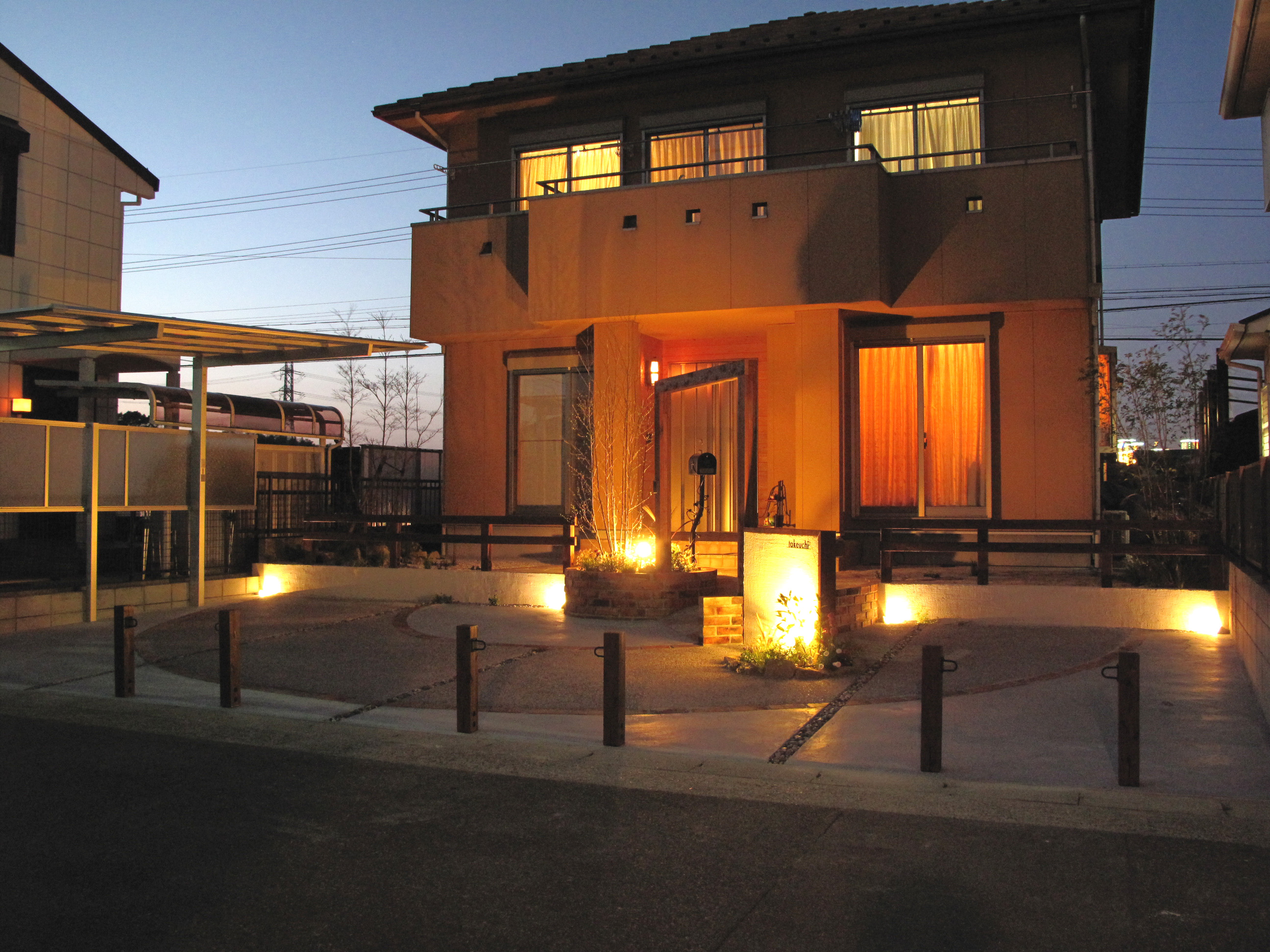 が庭全体を暖色に変化させ、夜遅く帰宅される旦那さまをやさしく