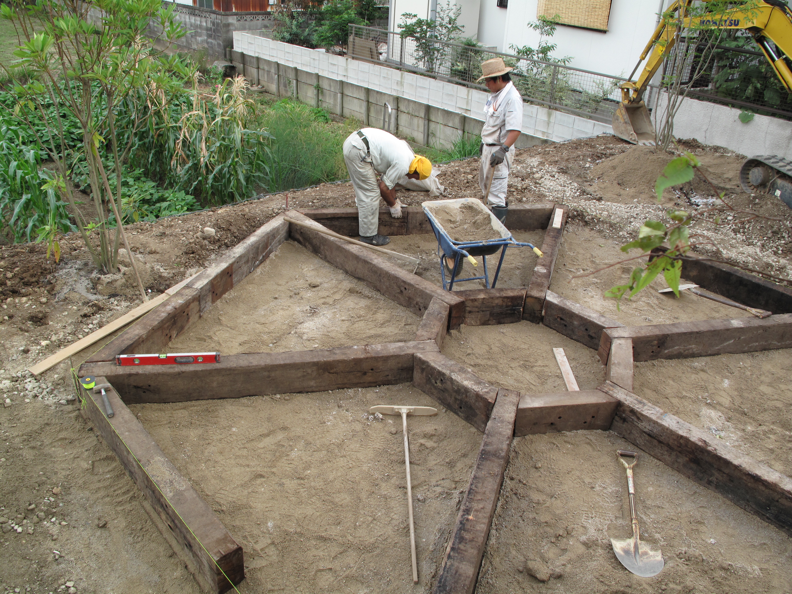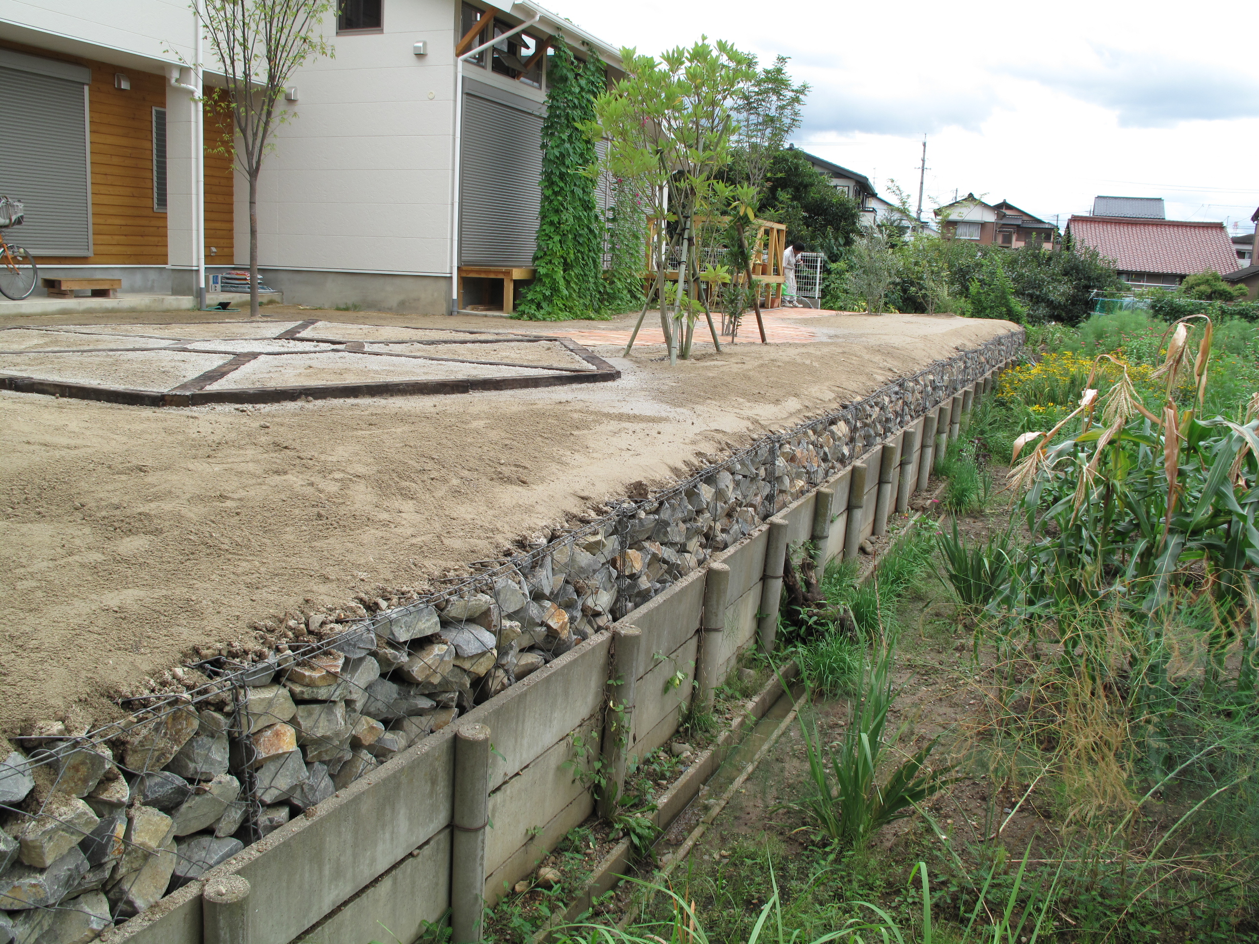 家庭菜園分の施工状況です。休耕しながらの野菜作りができるよう、枕木で区切りました。オーストラリア産の古枕木なので 薬液加工がしていないため 安心して農作物が食べられます。