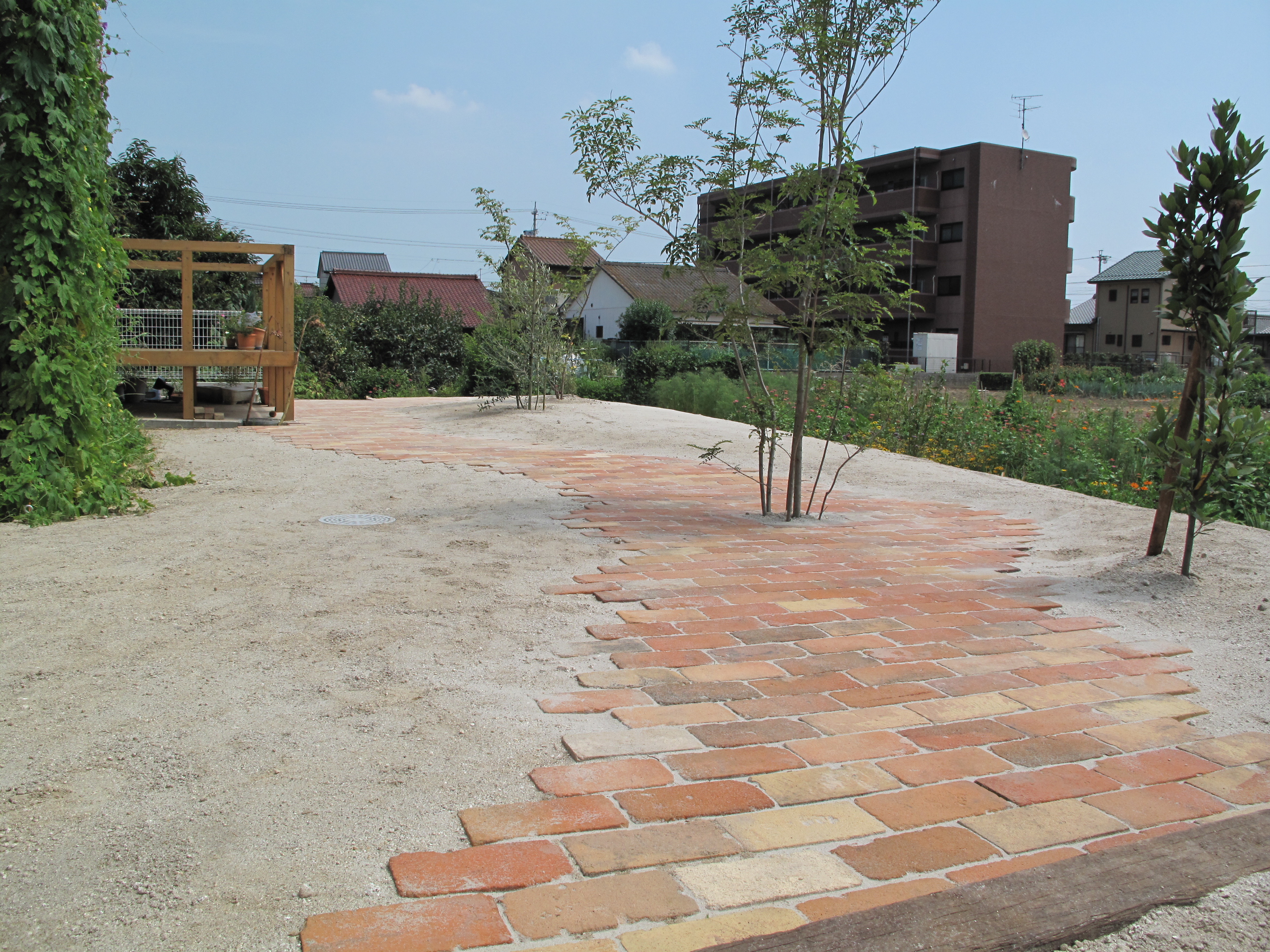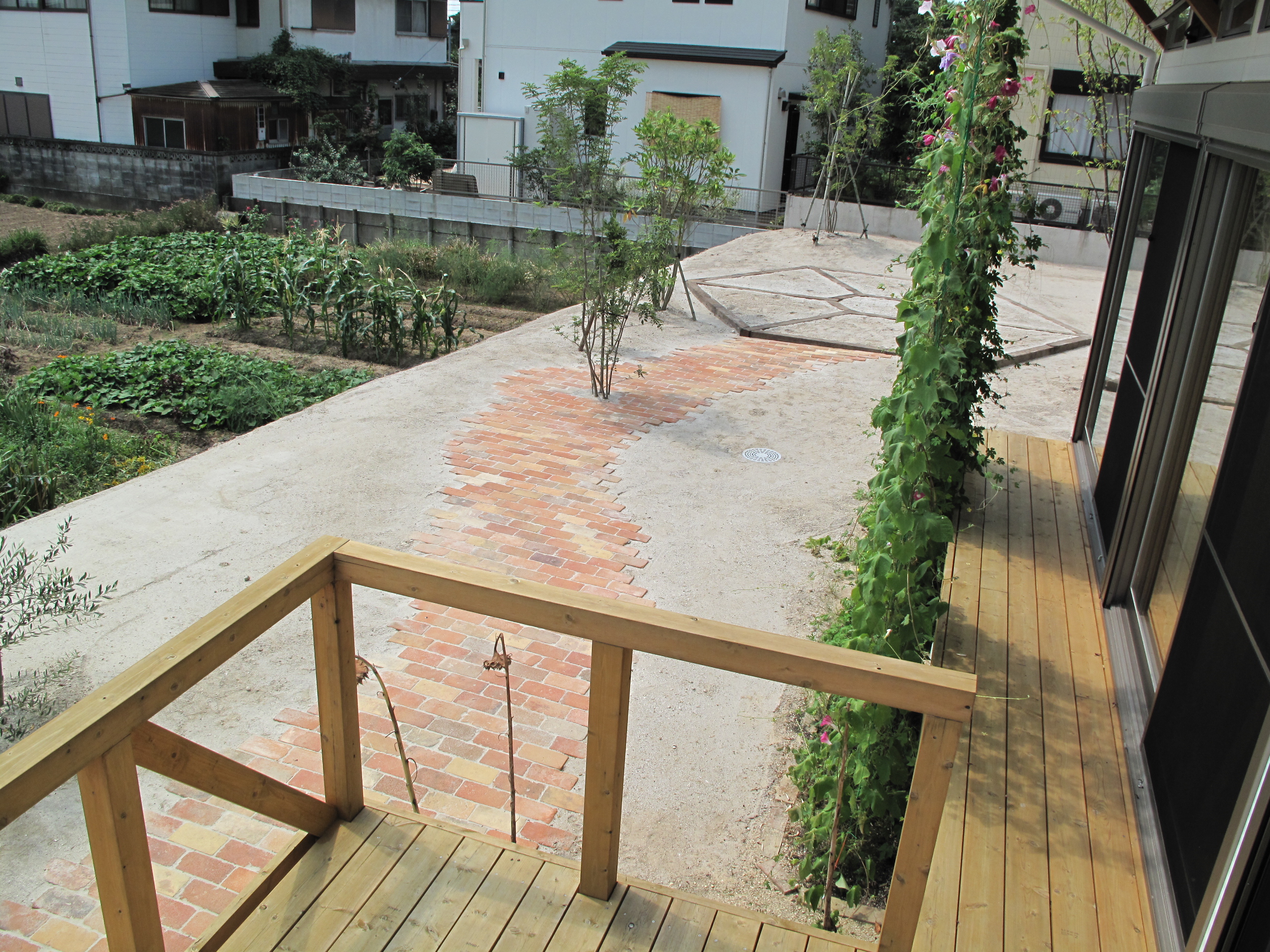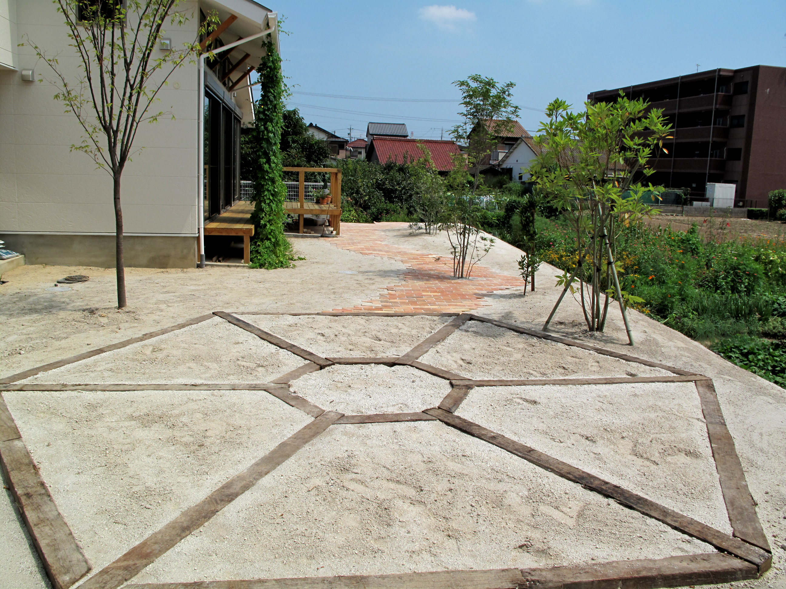 花壇と庭のスペースを散歩道で区切ることにより コストを抑えています