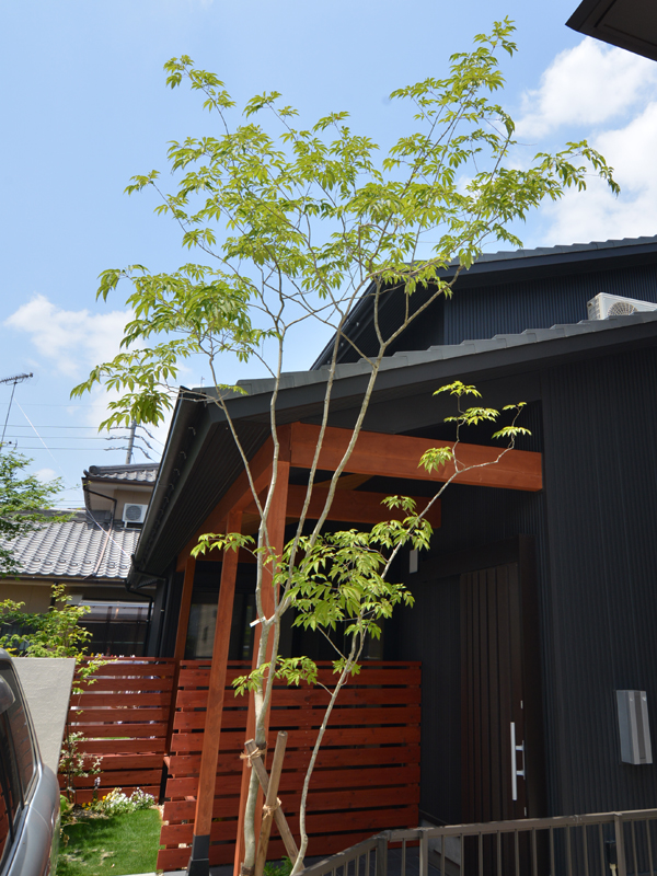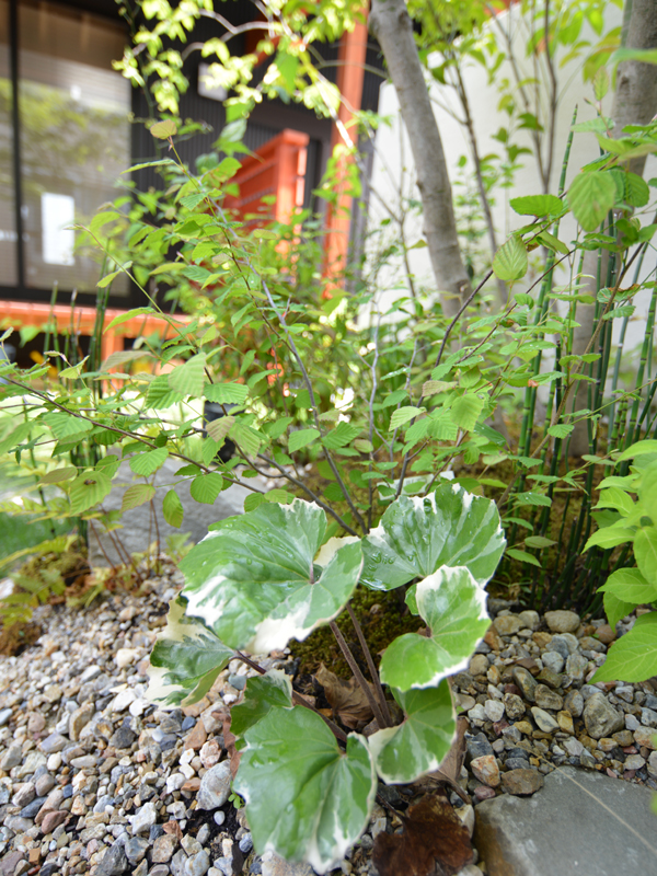 既存の門袖を利用し、植栽に立体感を出し素敵な坪庭が完成しました。