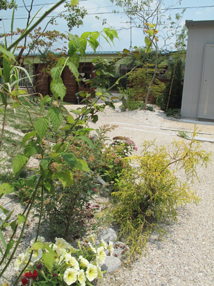 玄関が直接見えないように高さのある低木類やグラス系の植物を配置しアイストップとしました。