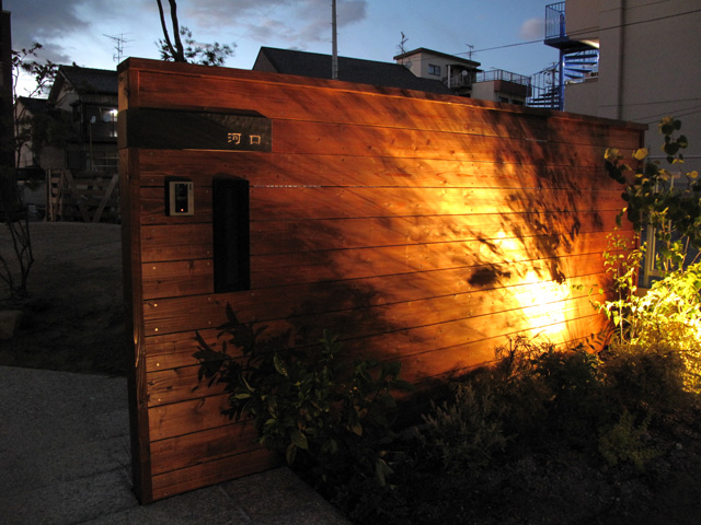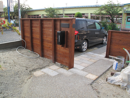 エコアコールウッドの門塀。ハイパーテーションでK様邸の顔となっています。