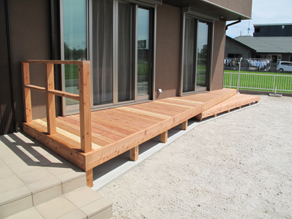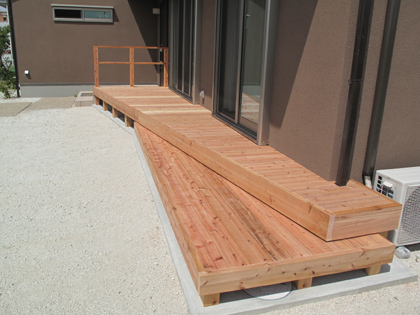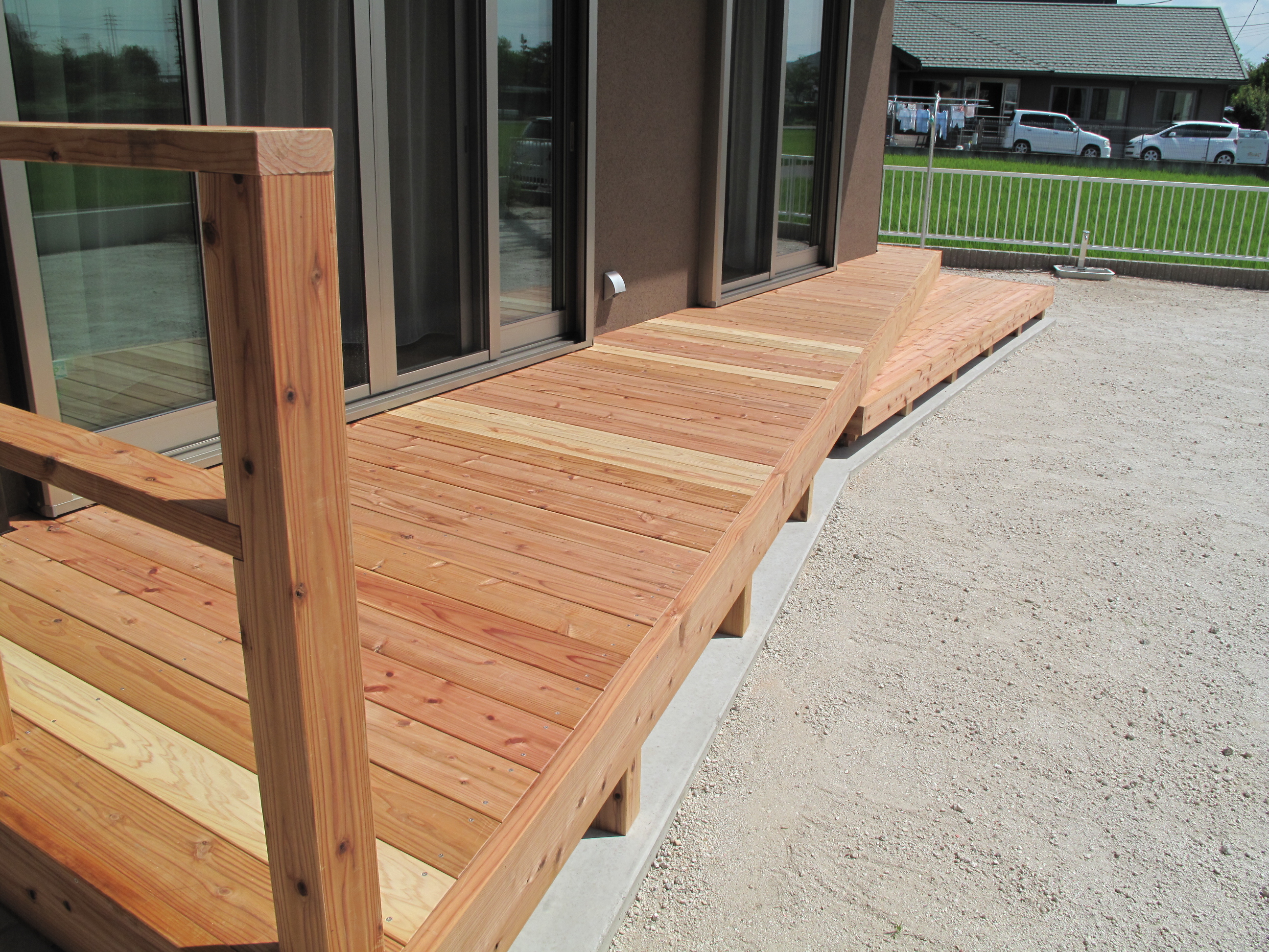 和風モダンなたたずまいのK様邸。 ウッドデッキのイメージはモダン縁側。 使用用途は縁側でもスタイリッシュなデザインでモダンなイメージに仕上げます