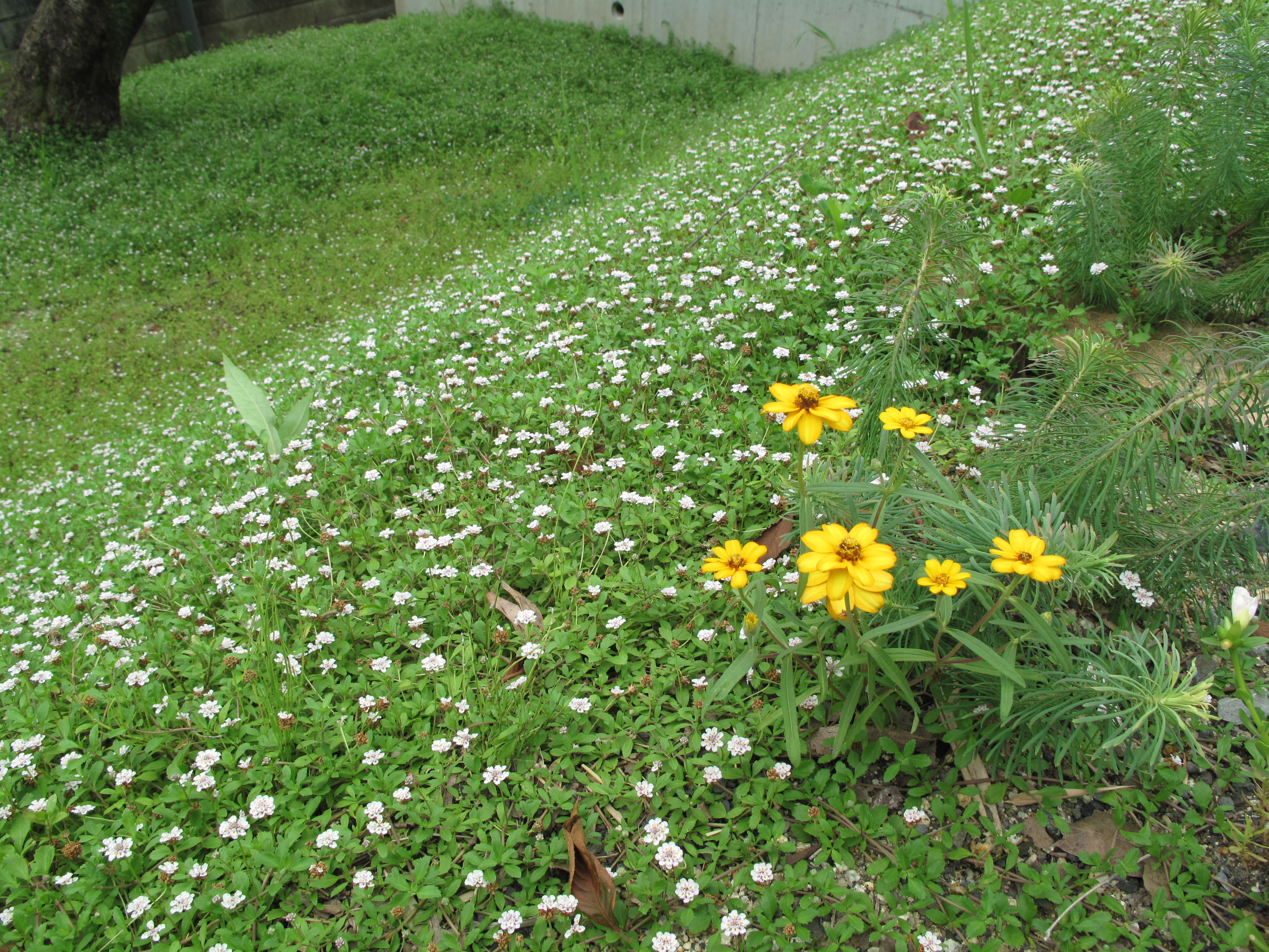 春から夏にかけてはかわいい花をつけてくれます。 リピアの生命力と地面に光が当たらないため雑草もほとんど生えません。