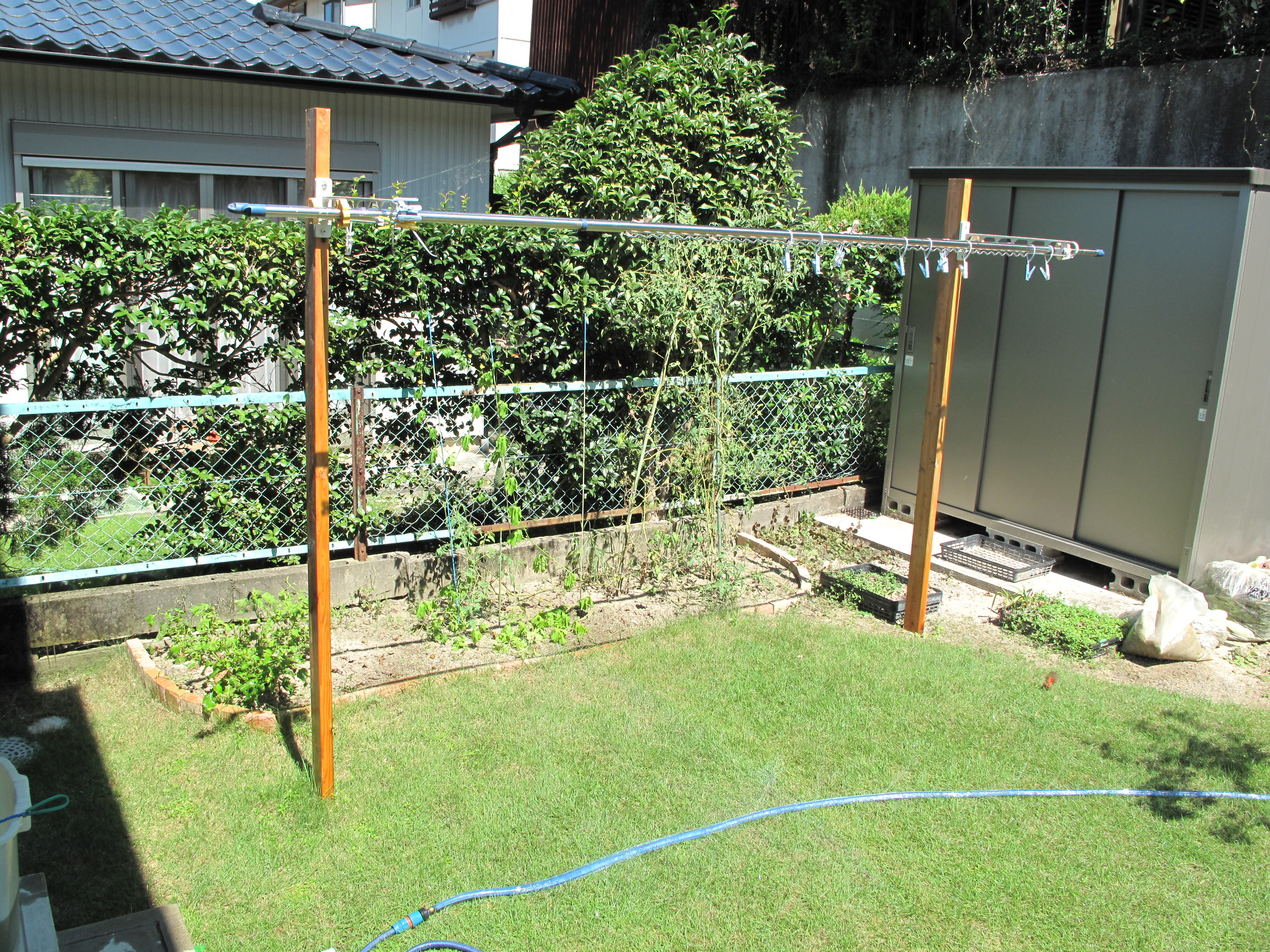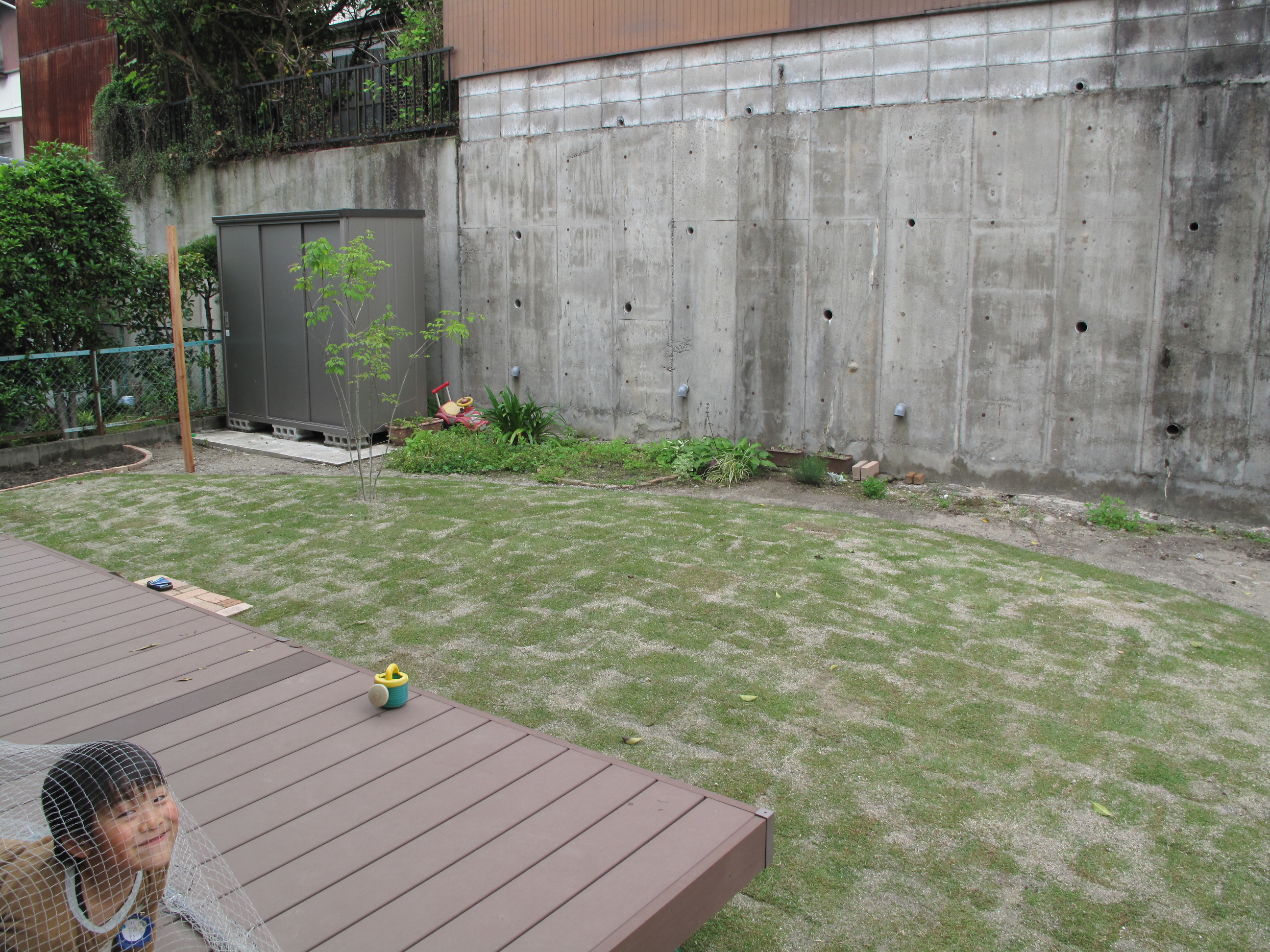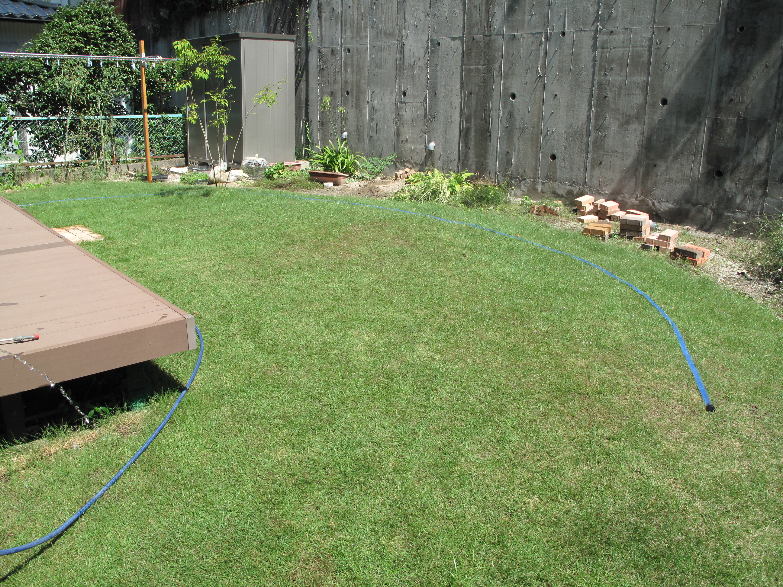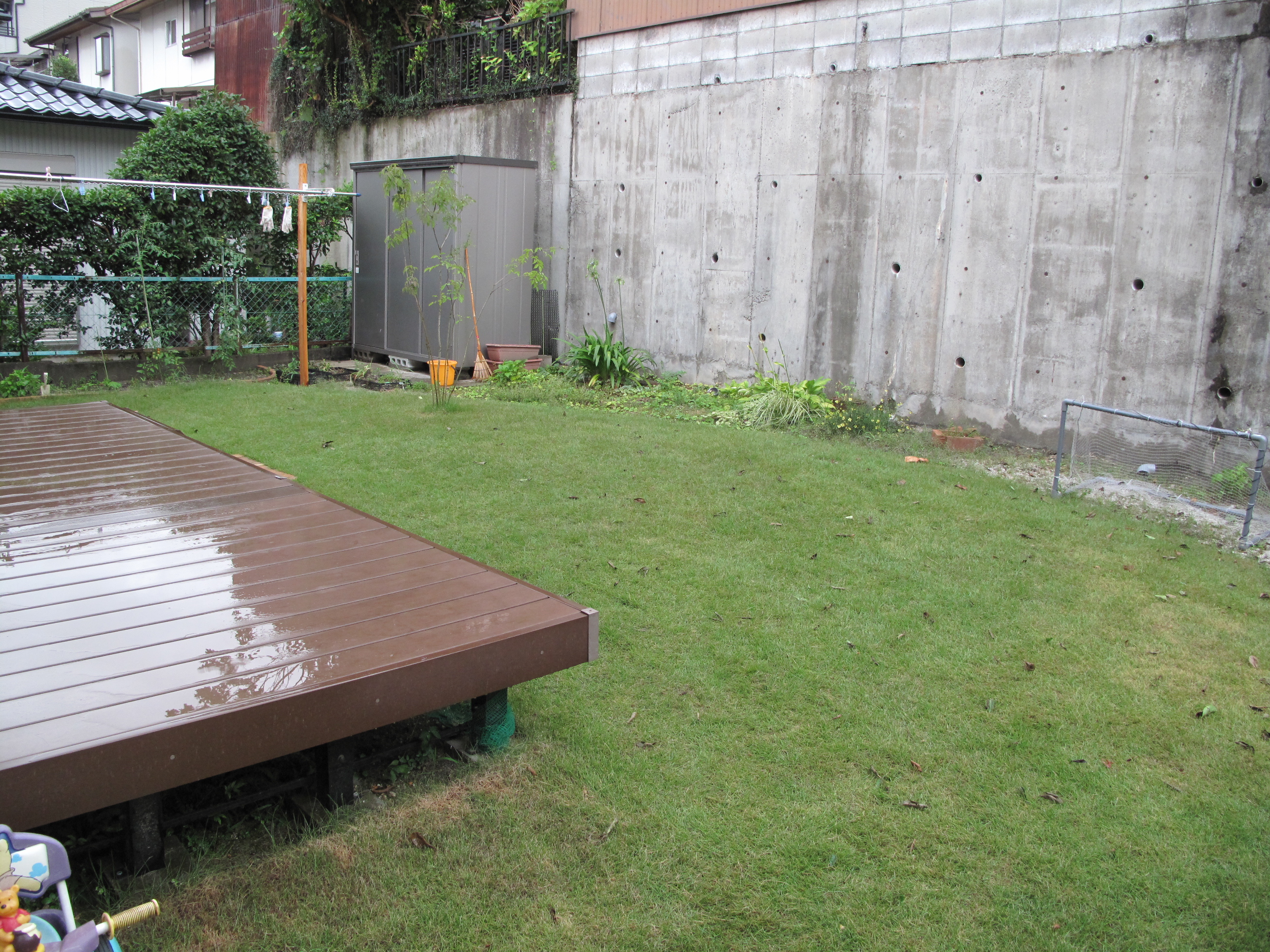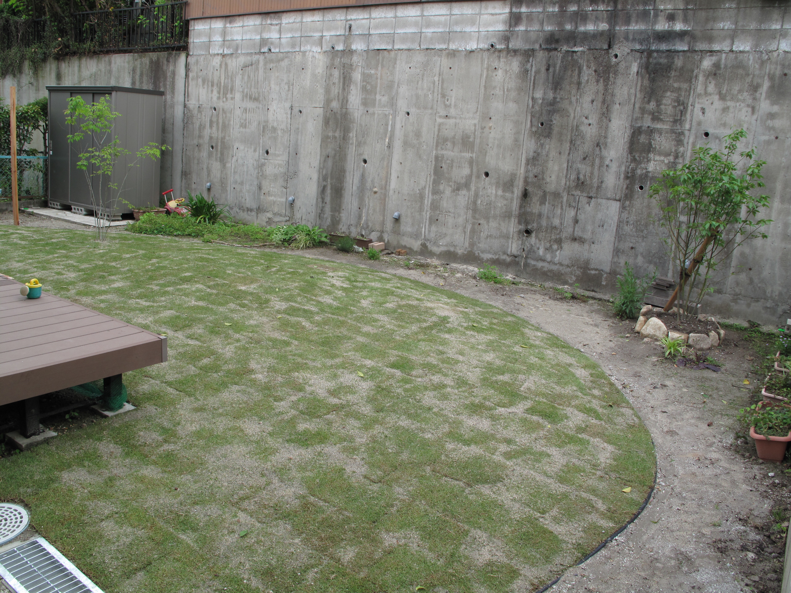 芝との花壇部分に段差をつけ、全体の勾配を取ることにより、上から来る水の通り道をつくり水の悩みを解消しています。